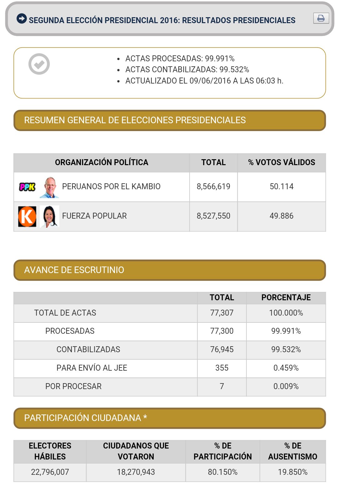 Al 99'9 % escrutado, la tendencia ya es irreversible. Podemos confirmar que PEDRO PABLO KUCZYNSKI HA GANADO LAS ELECCIONES PRESIDENCIALES.