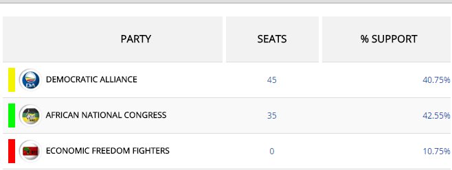 Pero ante el actual descontento de la población con la corrupción y el paro del gobierno Zuma, la población apenas ha optado por la vía radical del EFF y han preferido decantarse por la DA, que luego de una profunda y necesaria renovación al fin presentarion a su primer líder negro en 22 años: Mmusi Maimane.