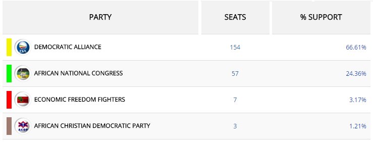 Ciudad del CaboCabe contar también el caso de Nkanda, una pequeña ciudad del este que tiene la vitola de ser el hogar natal del presidente Zuma. Sin embargo, el ANC del presidente ha perdido la alcaldía frente a un partido minoritario zulú.